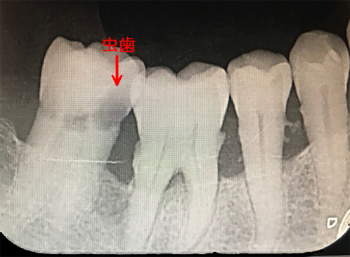 こちらはレントゲンですが、左端の奥歯に虫歯で大きな穴が開いているのがわかります。