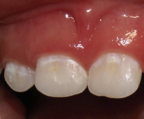 歯の表面がちょっと白くなっています。エナメル質の表層が溶け始めているのです。